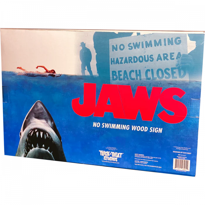 Trick or Treat Studios and Universal Studios are proud to present the Official JAWS No Swimming Wood Sign. This beautiful sign is made in solid wood with a bright solid landscape and printed design. The dimensions of the sign are 18" x 12", has a hook in the center for easy hanging and comes in a beautiful box. So order your JAWS No Swimming Wood Sign Prop now and warn your friends about the monster that lurks in the waters of Amity Island! © Universal City Studios LLC. All Rights Reserved. |